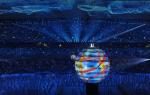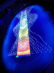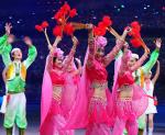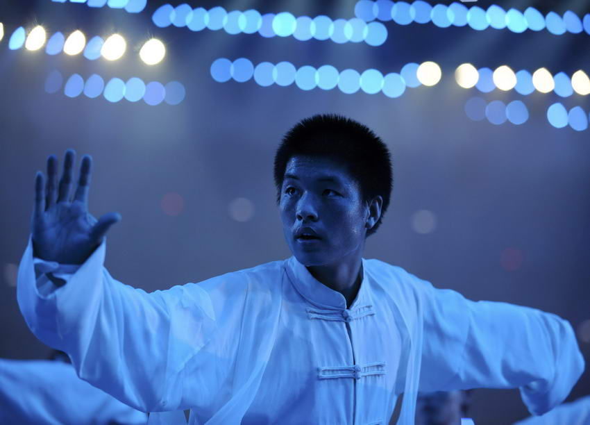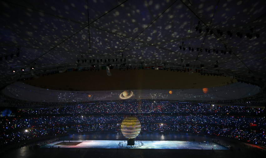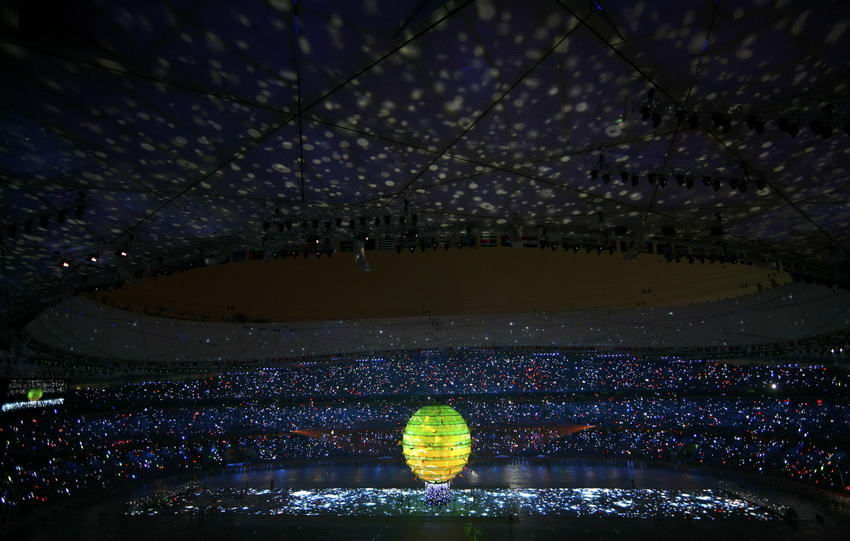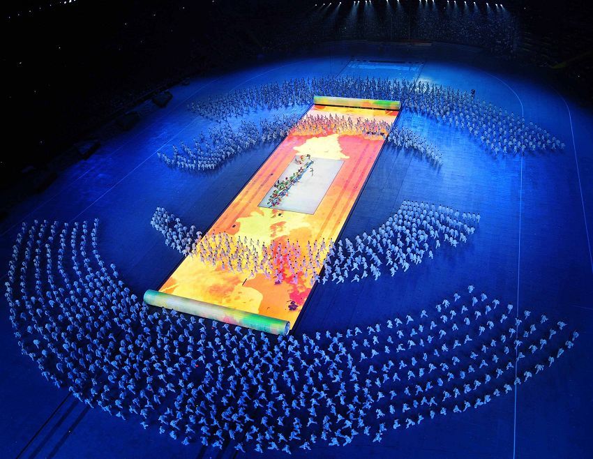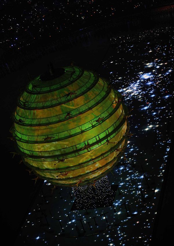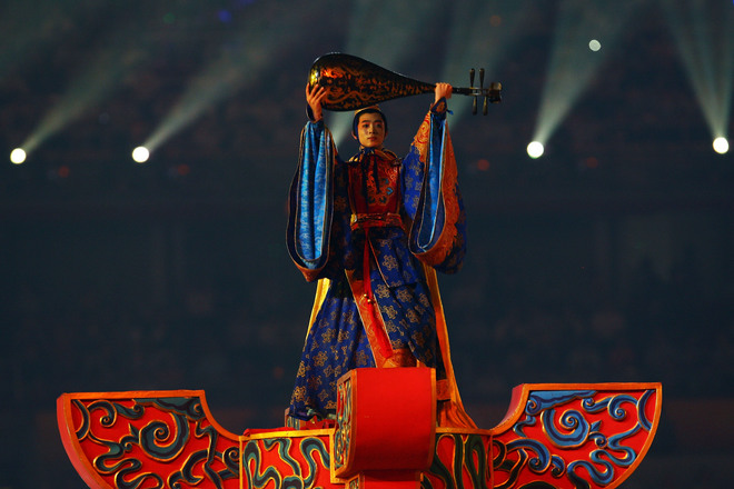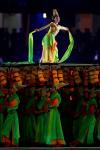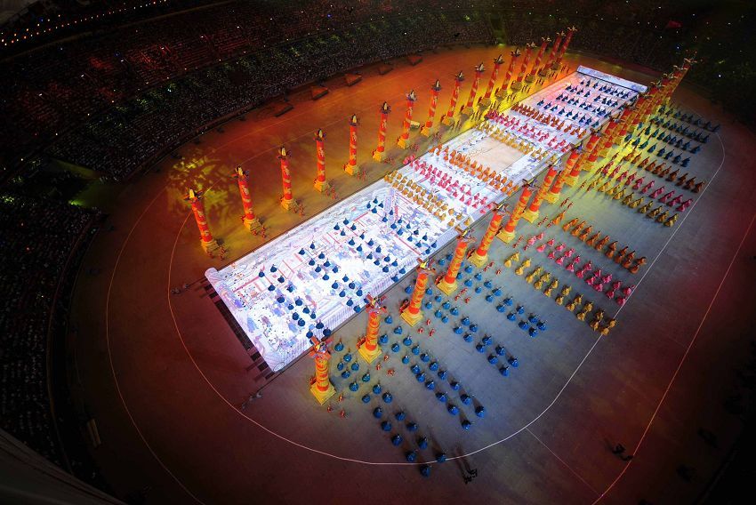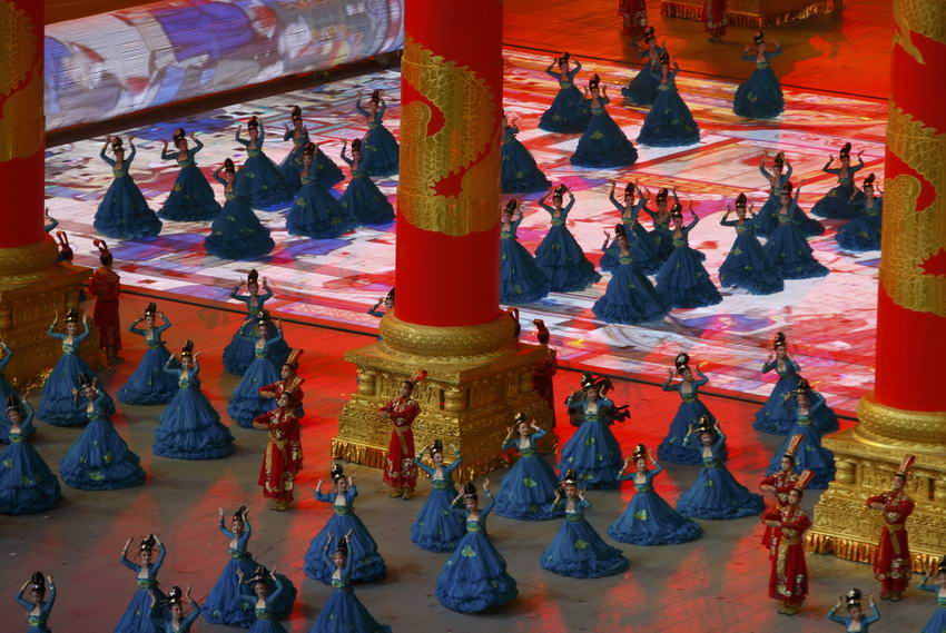 ม้วนกระดาษขนาดใหญ่ปรากฏกลางสนามพร้อมกับคลี่ออกอย่างช้าๆ และฉายภาพเครื่องถ้วยโบราณของจีน ส่วนตรงกลางของม้วนกระดาษเป็นผืนผ้าใบซึ่งมีนักแสดงที่แต่งชุดดำและทาหมึกไว้ทั่วตัวกลิ้งตัวไปมาเป็นรูปท้องฟ้า ภูเขา และดวงอาทิตย์ สื่อให้เห็นถึงการเขียนภาพด้วยหมึกจีน