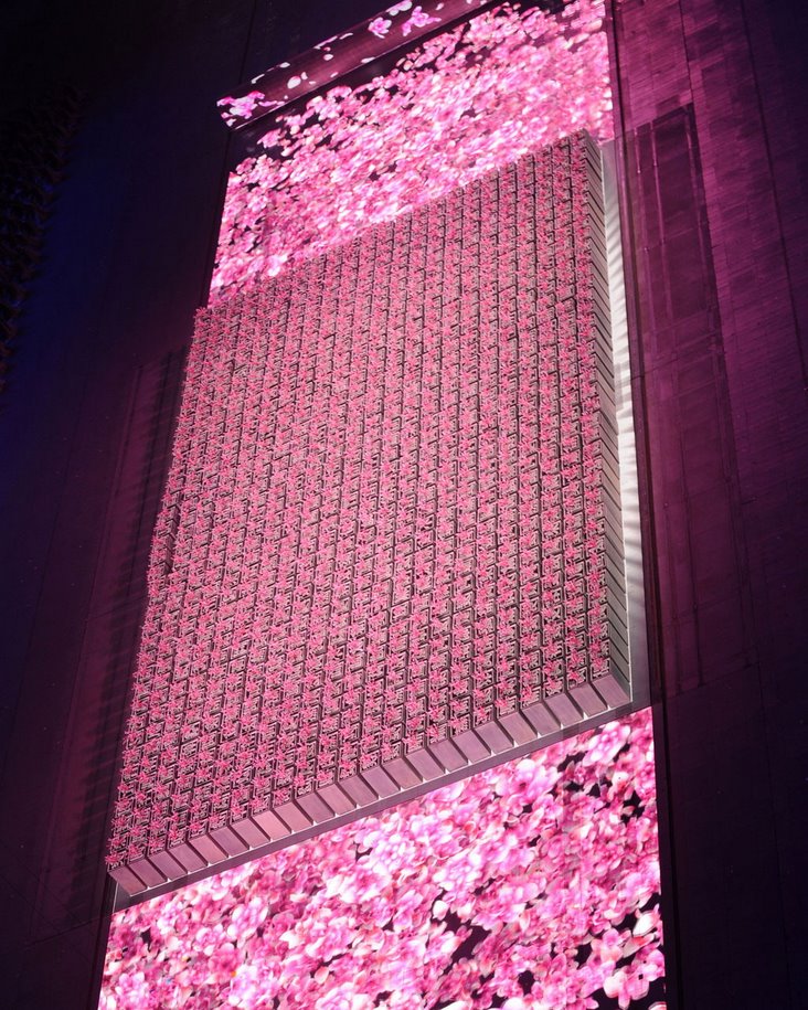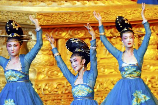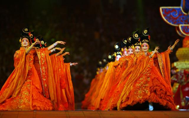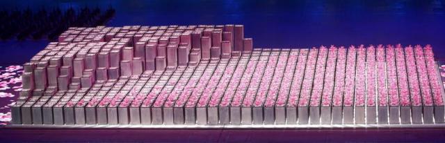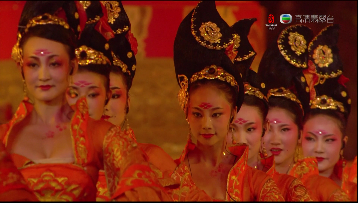 a troupe of female dancers dressed in Tang-era clothing entered, suspended by a rectangular extension held by hundreds of performers. On the