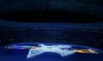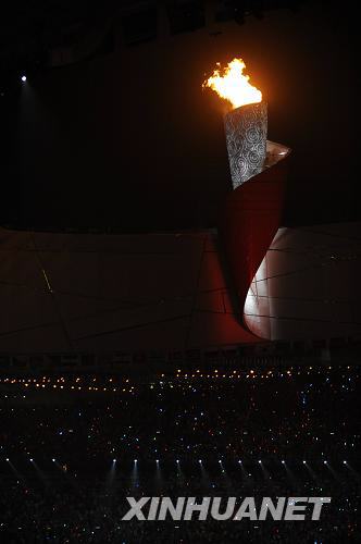 The Chinese singer Liu Huan and British singer Sarah Brightman, standing on the central platform, sang the 2008 Olympic theme song: You