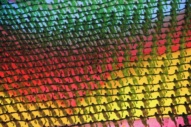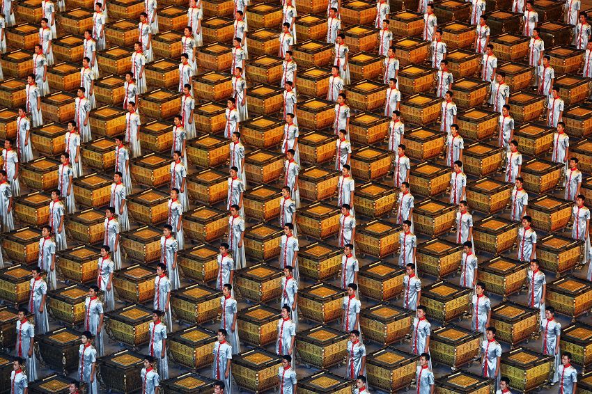 นักแสดงจำนวน 897 คน ถือบล็อกอักษรจีนที่ไม่ซ้ำกัน