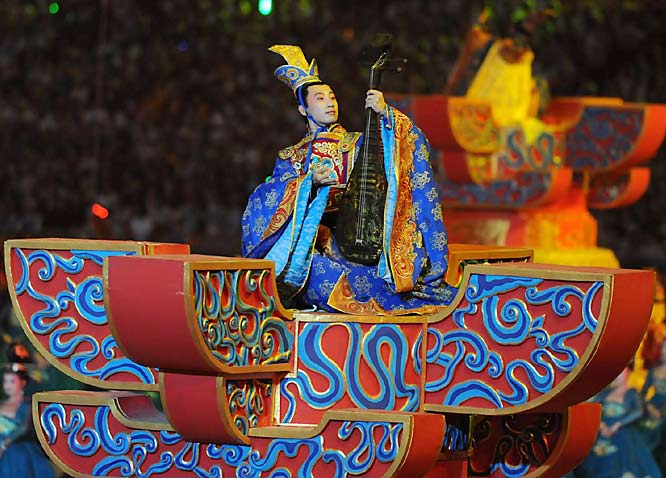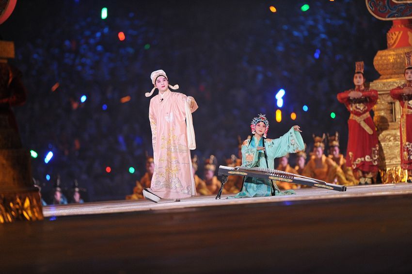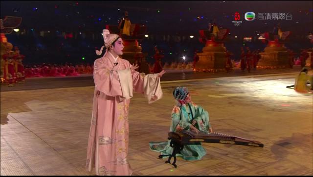 การแสดง kunqu ซึ่งเป็นงิ้วประเภทหนึ่ง มีผู้แสดงชายหนึ่งคน หญิงหนึ่งคน ยืนร้องเพลงบนผืนผ้าใบ จากนั้น เหล่านางระบำในชุดสมัยราชวงศ์ถังก็เข้าสู่สนาม พร้อมกับมีแท่นที่มีนักแสดงชายถือพิณจีน จำนวน 14 แท่น และแท่นเหล่านั้นได้ยกขึ้นเป็นเสาคล้ายเสามังกรในพระราชวังต้องห้าม (huabiao (华表))