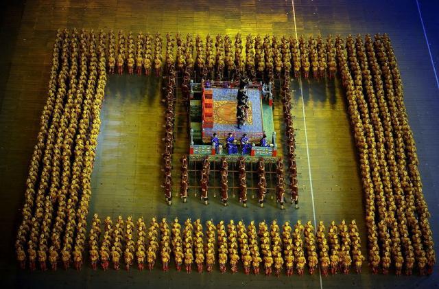 การแสดง kunqu ซึ่งเป็นงิ้วประเภทหนึ่ง มีผู้แสดงชายหนึ่งคน หญิงหนึ่งคน ยืนร้องเพลงบนผืนผ้าใบ จากนั้น เหล่านางระบำในชุดสมัยราชวงศ์ถังก็เข้าสู่สนาม พร้อมกับมีแท่นที่มีนักแสดงชายถือพิณจีน จำนวน 14 แท่น และแท่นเหล่านั้นได้ยกขึ้นเป็นเสาคล้ายเสามังกรในพระราชวังต