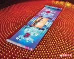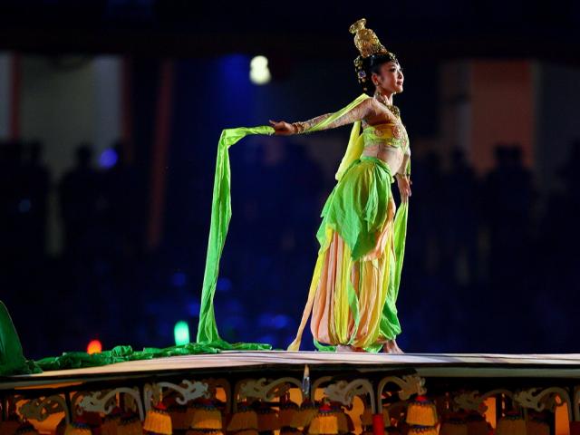 a troupe of female dancers dressed in Tang-era clothing entered, suspended by a rectangular extension held by hundreds of performers. On the ground was the map of the Silk Road.