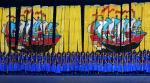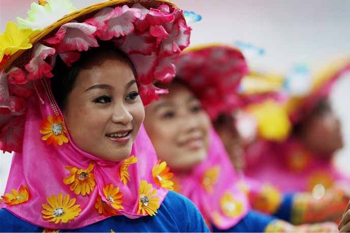 Another procession of men, in blue dress, with oars forming pictures of junks, symbolized the voyages of Zheng He.