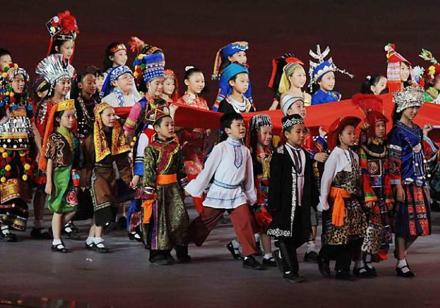 นักแสดงจำนวน 897 คน ถือบล็อกอักษรจีนที่ไม่ซ้ำกัน และแปรอักษรเป็นคำว่า 和 (การประสานสามัคคี) ในสามรูปแบบ คือ จารึกทองแดง ตราประทับโบราณ และอักษรซ่งตี้ แสดงให้เห็นถึงการคิดค้นและพัฒนาอักษรจีน นอกจากนี้ นักแสดงจำนวน 810 คน ที่แต่งชุดแสดงถึงลูกศิษย์ของขงจื้อ (Rujia) ในยุคราชวงศ์ฮั่น (ร่วมสมัยกับยุคสามก๊ก) โดยสวมหมวกขนนกและถือม้วนหนังสือไม้ไผ่ ได้วิ่งออกมาจากข้างสนาม พร้อมกับเสียงท่องปรัชญาของขงจื้อสองวรรค คือ "เป็นการดีมิใช่หรือที่จะมีมิตรจากแดนไกล" และ "มนุษย์ทั้งหลายคือพี่น้องจากทะเลทั้งสี่"