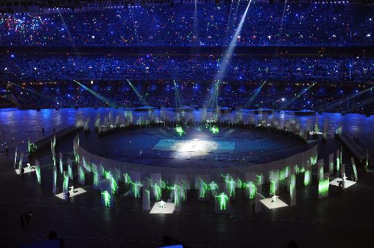 The Chinese singer Liu Huan and British singer Sarah Brightman, standing on the central platform, sang the 2008 Olympic theme song: You