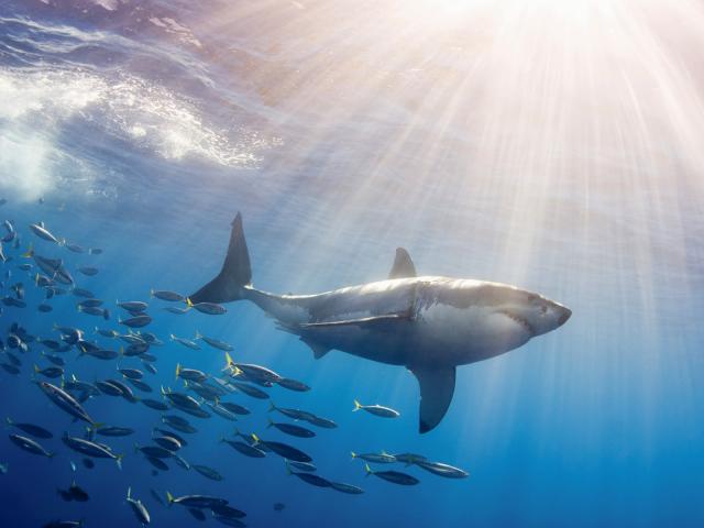 ocean-life-784A predator great white shark swimming in the ocean coral reef shallows just below the water line closing in on its victim. 3d rendering with god rays