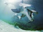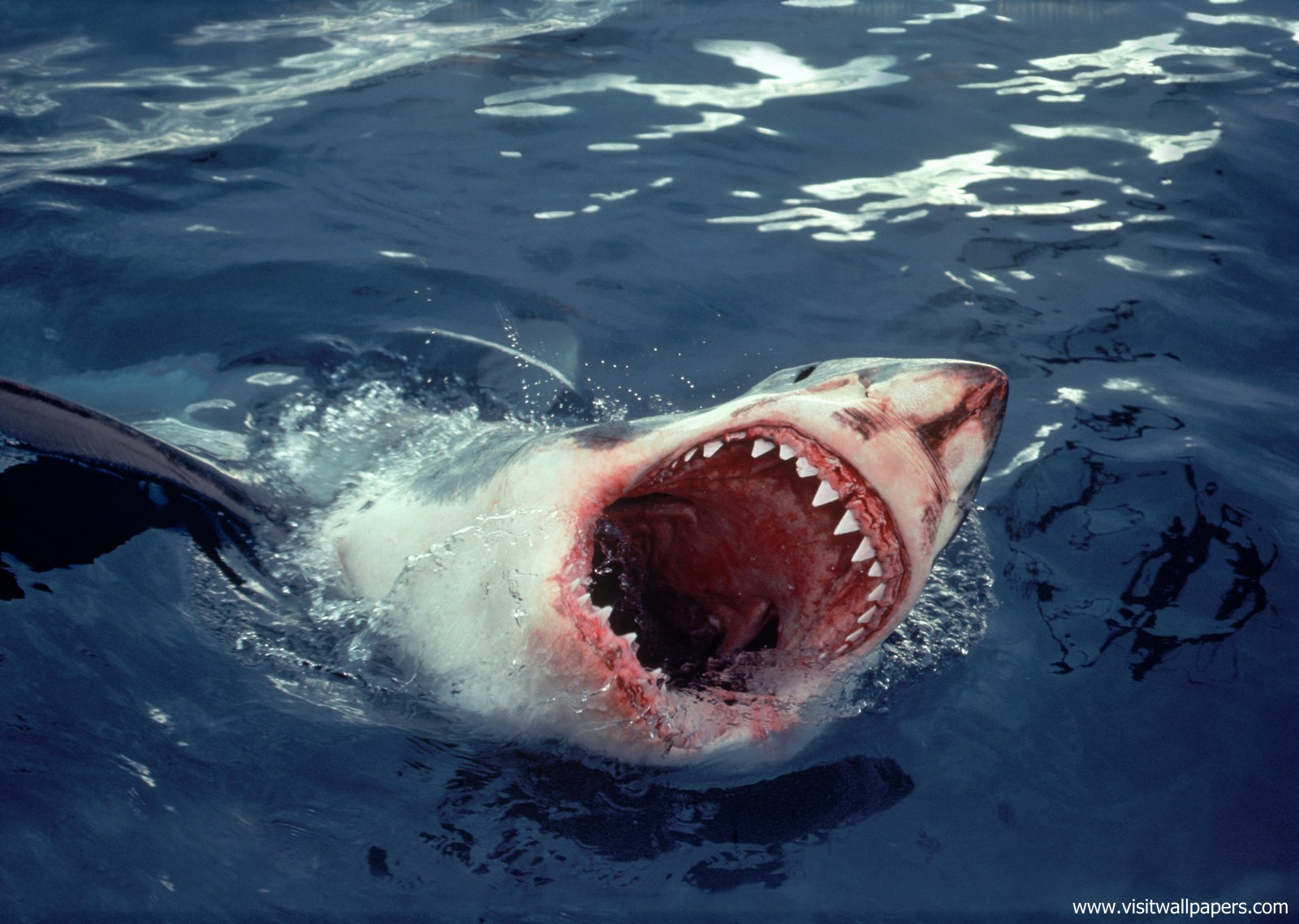 ocean-life-816Ocean shark bottom view from below. Open toothy dangerous mouth with many teeth. Underwater blue sea waves clear water shark swims forward