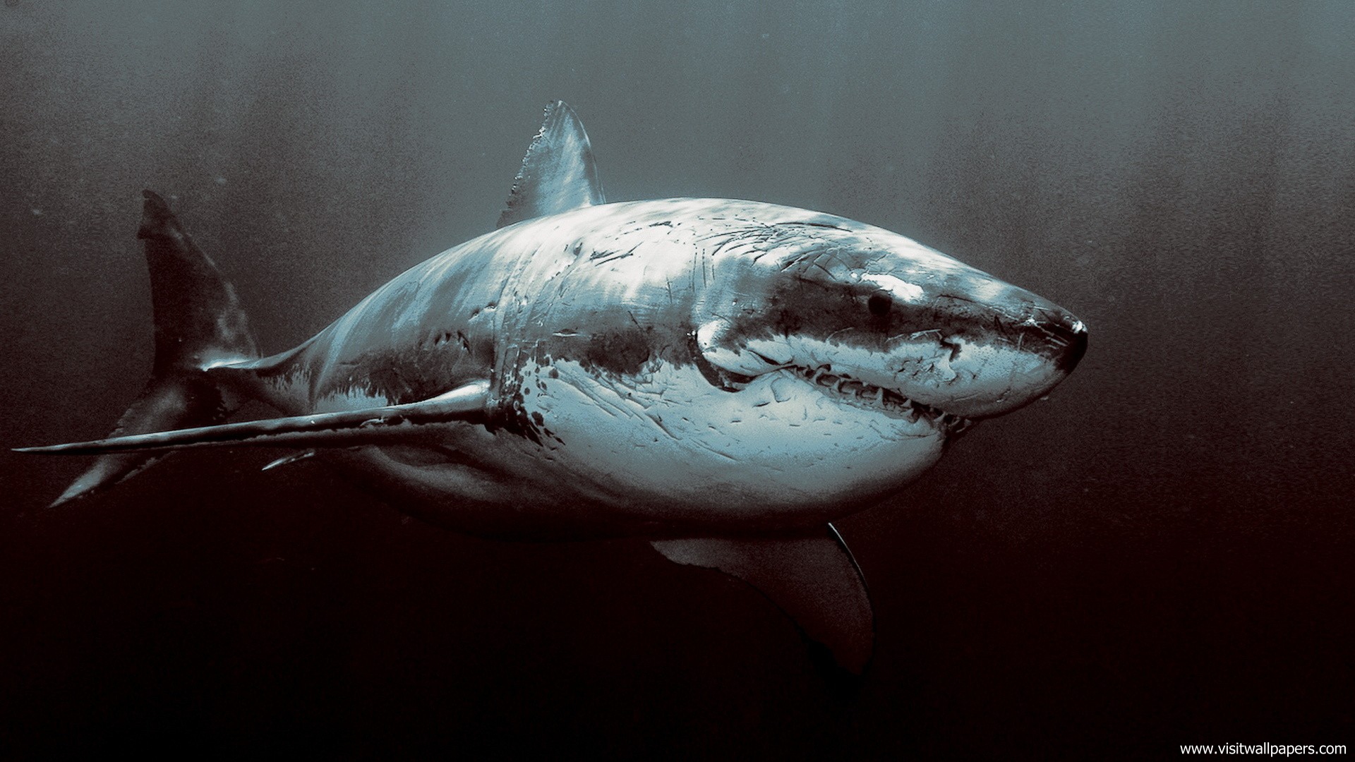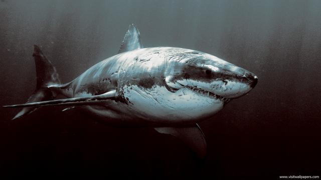 ocean-life-827Great White Shark swims near a diver in a shark cage, wearing a wetsuit and scuba gear, amidst ominous dark water.