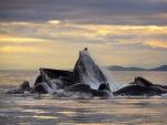 ocean-life-796Beautiful scene with killer whales (Orcinus orca) breathing on the ocean surface at sunrise with colorful clouds reflected in the water