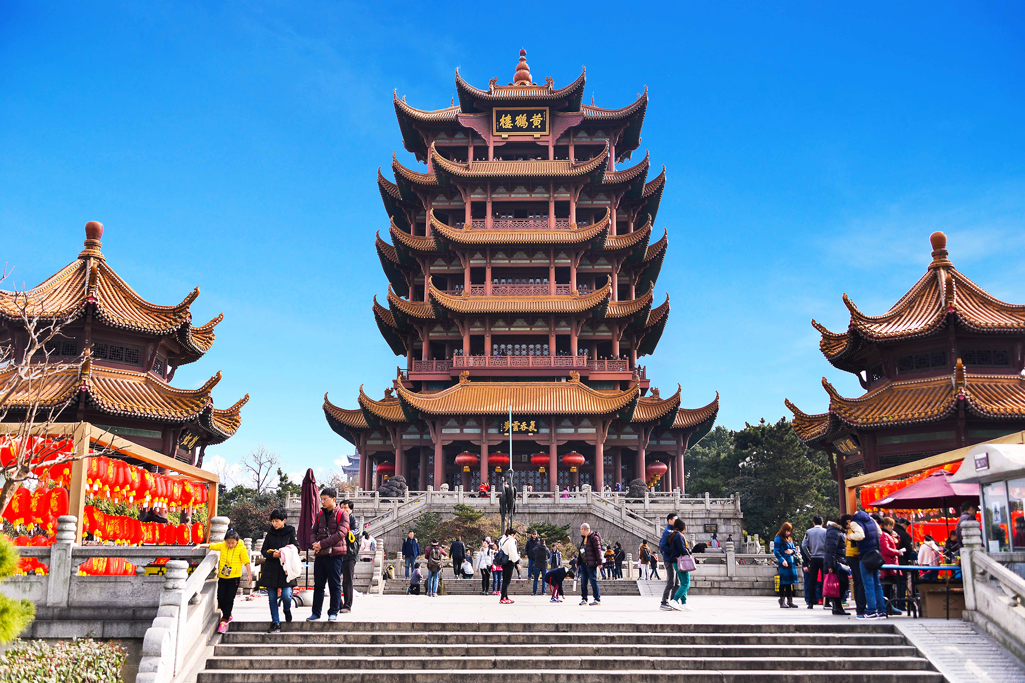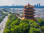 china_902Aerial view of Wuhan city. Panoramic skyline and buildings beside yangtze river. The yellow crane tower, located on snake hill in Wuhan, is one of the three famous towers south of yangtze river, China. 4 Chinese letters on tower is "Nang Xiong Gao