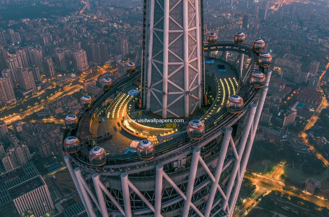 china_980Guangzhou, China - Bubble tram on the top of Canton tower in Guangzhou, at 455m elevation, seen from inside one of the bubbles. Canton Tower is the second tallest tower in China