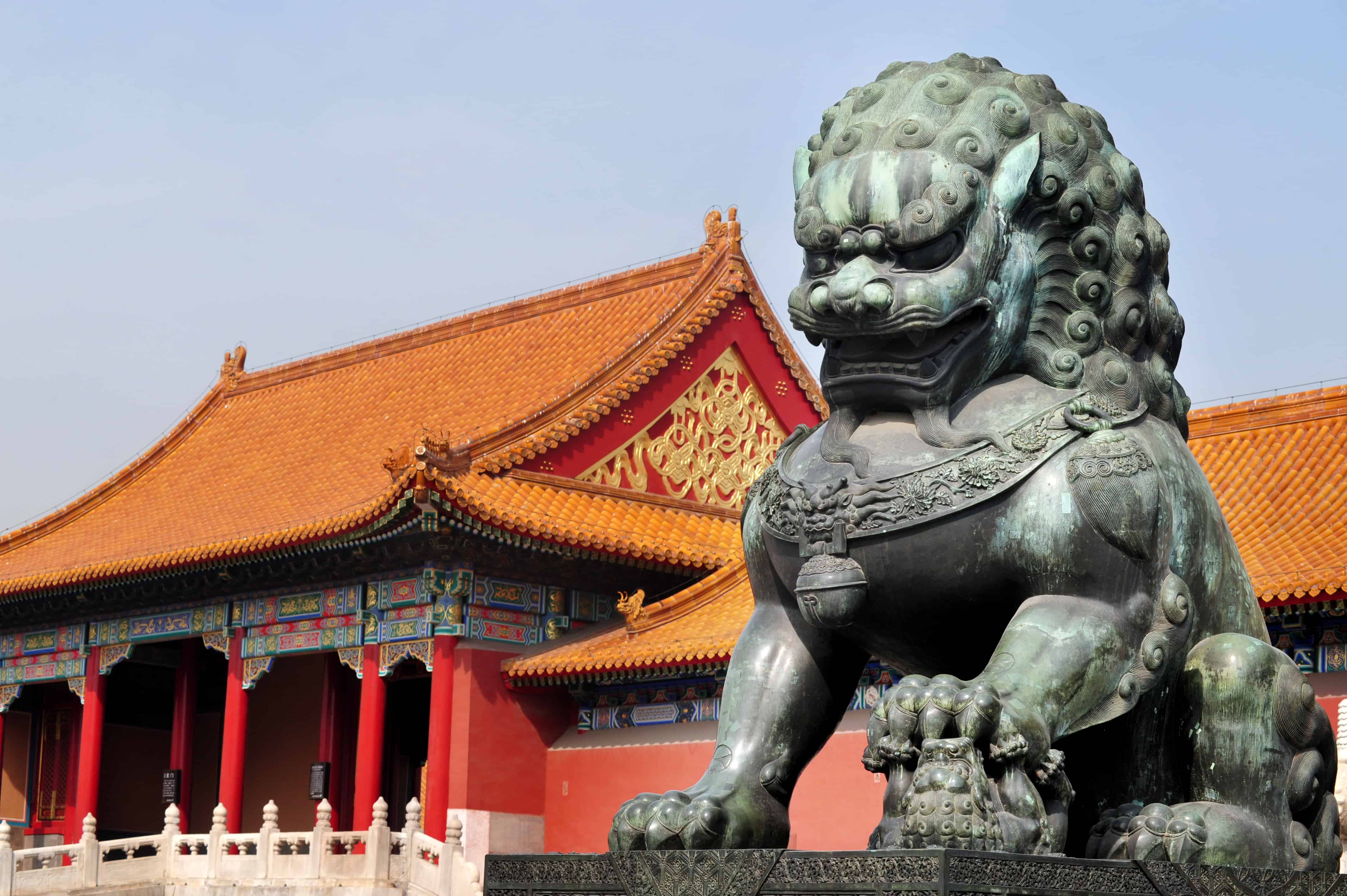 Bronze lion at the Forbidden City, Beijing, China. Chinese cultural symbols