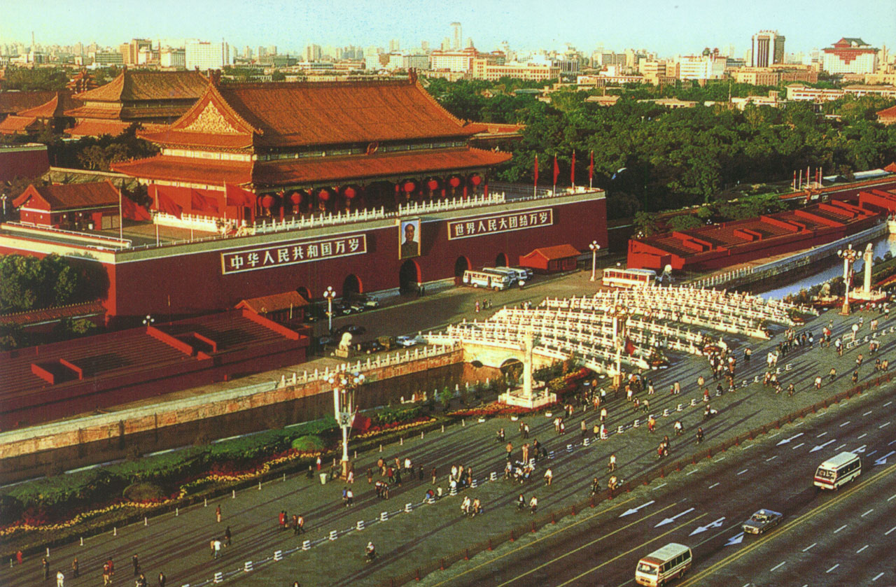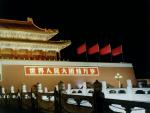 China Tiananmen gate with Great Wall in background. Chinese text on the red wall reads: Long live China and the unity of all peoples in the world.
