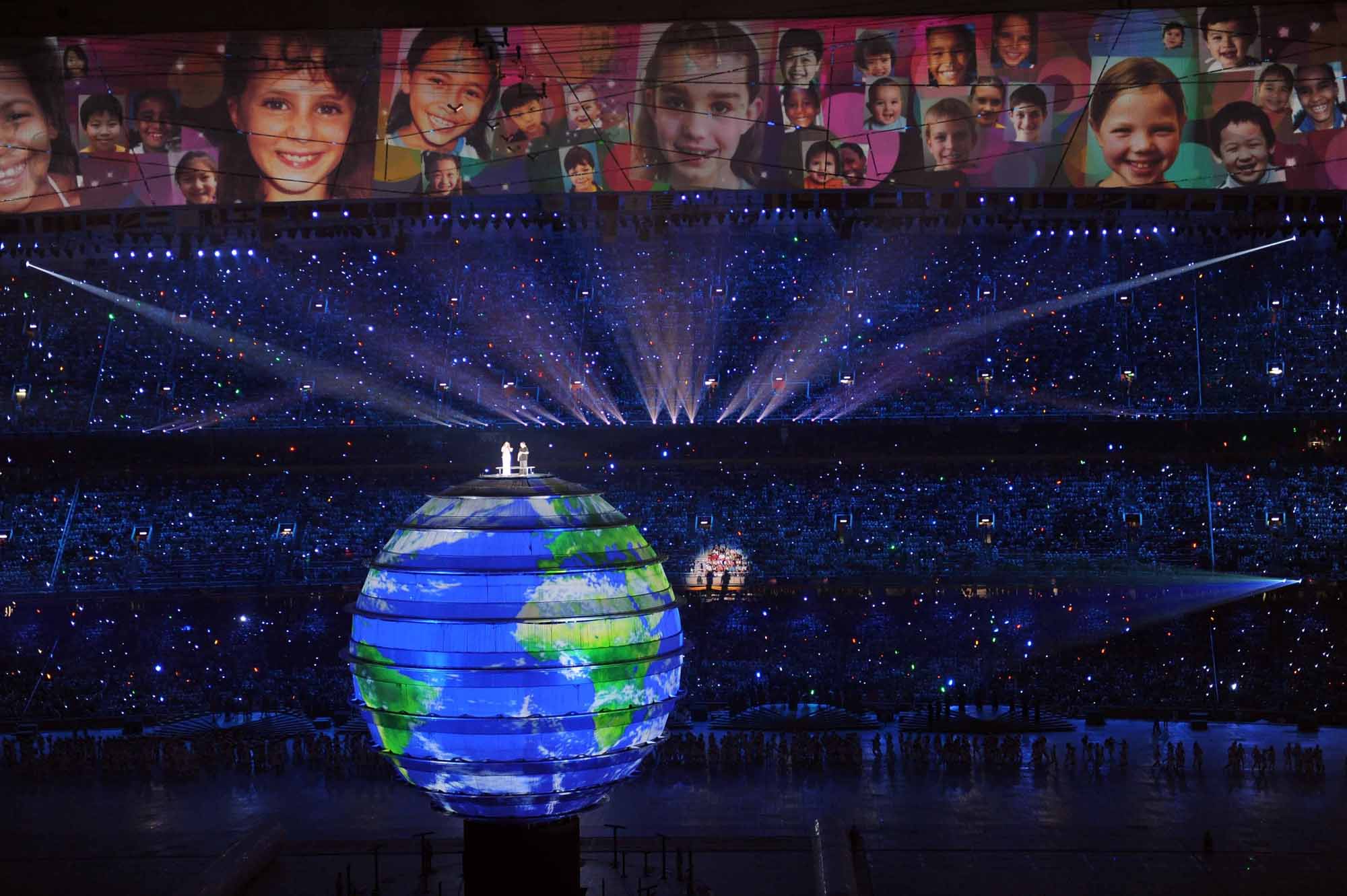 The Chinese singer Liu Huan and British singer Sarah Brightman, standing on the central platform, sang the 2008 Olympic theme song: You
