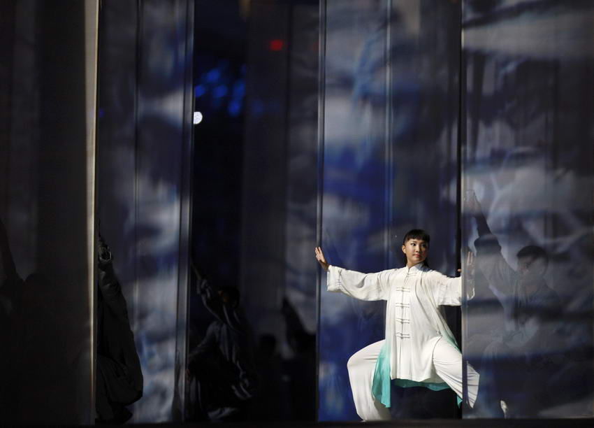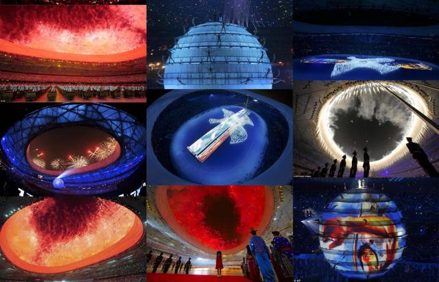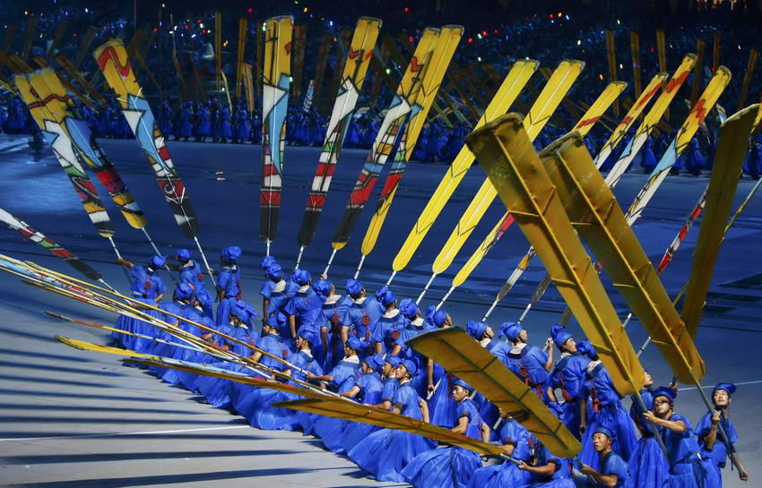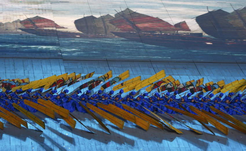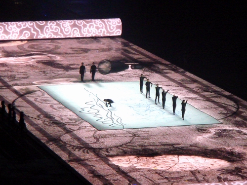 ม้วนกระดาษขนาดใหญ่ปรากฏกลางสนามพร้อมกับคลี่ออกอย่างช้าๆ และฉายภาพเครื่องถ้วยโบราณของจีน ส่วนตรงกลางของม้วนกระดาษเป็นผืนผ้าใบซึ่งมีนักแสดงที่แต่งชุดดำและทาหมึกไว้ทั่วตัวกลิ้งตัวไปมาเป็นรูปท้องฟ้า ภูเขา และดวงอาทิตย์ สื่อให้เห็นถึงการเขียนภาพด้วยหมึกจีน