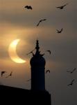 solar_eclipse_3A partial solar eclipse silhouettes birds surrounding a minaret of the shrine of Sufi Saint Bah-ud-din Zakria in Multan, Pakistan on Wednesday, July 22, 2009. The longest solar eclipse of the 21st century pitched a swath of Asia into near-darkness after d