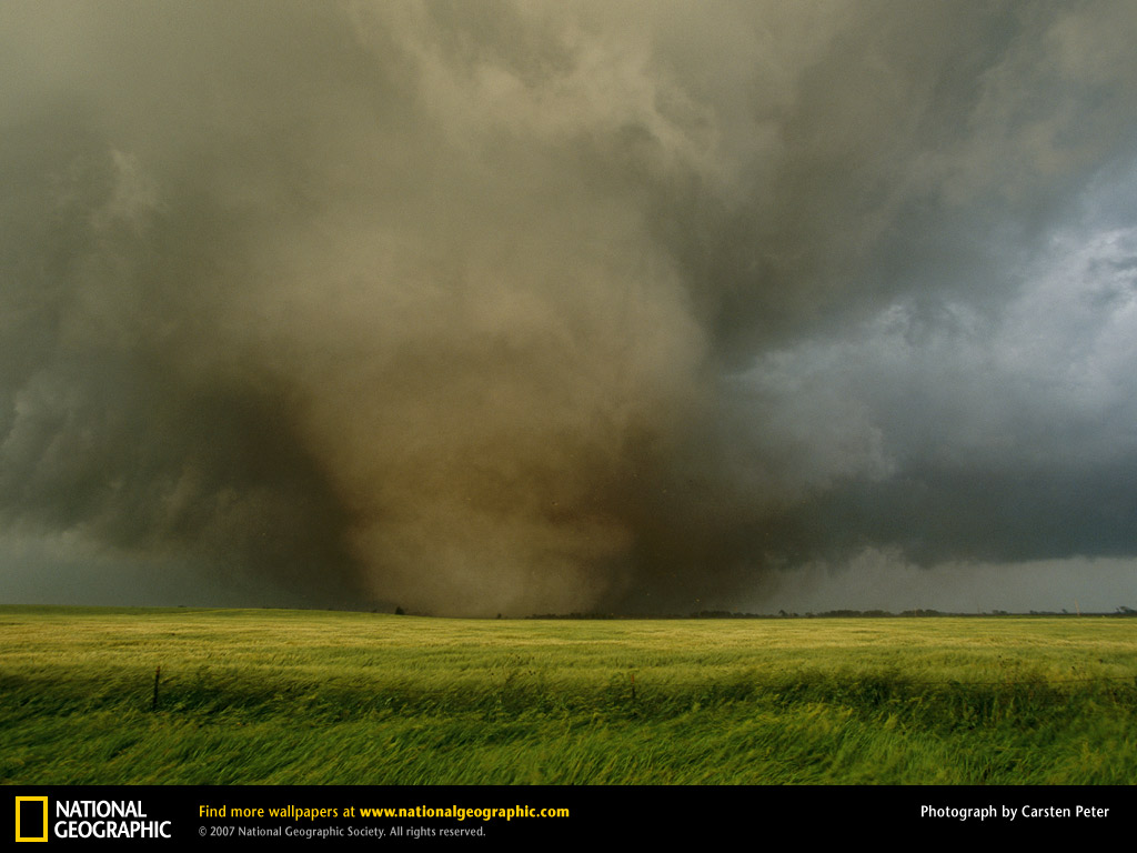 ng4_502Grasses flatten as a dust-darkened F4 Category tornado roars across the South Dakota prairie. Twisters are colorless, but they usually take on the color of the dirt, debris, or dust they pick up. In some areas, red earth produces dramatic scarlet-hued tor