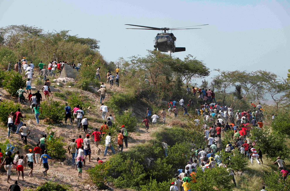 haiti_sixdayslater_001People run toward a U.S. helicopter as it makes a water drop near a country club used as a forward operating base for the U.S. 82nd Airborne Division in Port-au-Prince, Haiti, Saturday, Jan. 16, 2010. Relief groups and officials are focused on moving aid