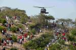 People run toward a U.S. helicopter as it makes a water drop near a country club used as a forward operating base for the U.S. 82nd Airborne Division in Port-au-Prince, Haiti, Saturday, Jan. 16, 2010. Relief groups and officials are focused on moving aid flowing into Haiti to survivors of the powerful earthquake that hit the country on Tuesday. (AP Photo/Jae C. Hong)