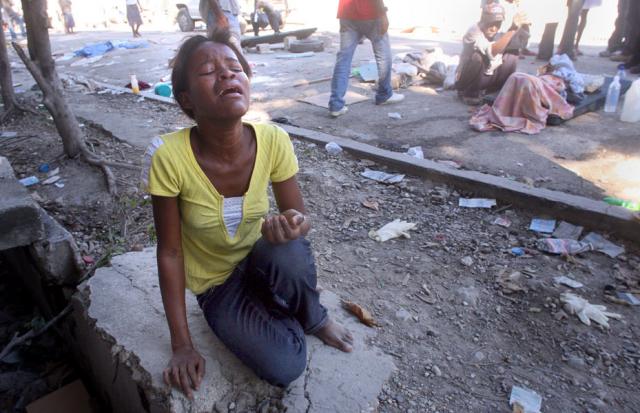 haiti_34A person sits on the ground in front of a destroyed building in Port-au-Prince after a huge earthquake on January 12, 2010. (LISANDRO SUERO/AFP/Getty Images)