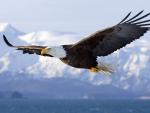Birds_347American bald eagle in flight illustration over snow-capped mountains in Alaska's Kenai Mountains, high resolution capture.