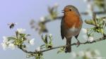 Birds_372Beautiful background image of a wild robin (Erithacus rubecula) with stunning colors and a monarch butterfly (Danaus plexippus) standing on a branch. Tiny and cute bird looking at a prey butterfly.