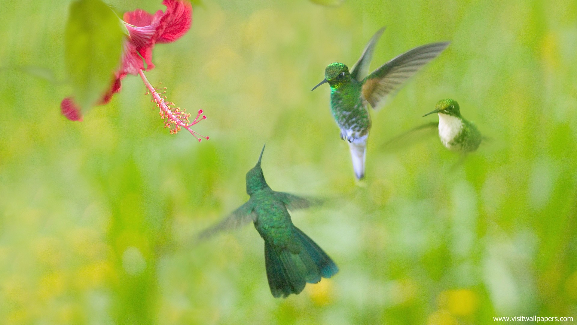 Birds_307Hummingbird Green-crowned Brilliant, Heliodoxa jacula, green bird from Costa Rica flying next to beautiful red flower with clear background, wildlife