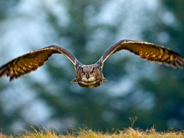 Birds_385Eurasian eagle-owl, Bubo bubo, flying bird with open wings over grassy meadow, forest in the background, animal in the nature habitat, Sweden.