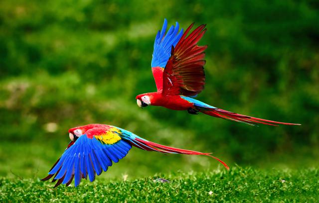 Birds_354Two Scarlet Macaw parrots, flying just above the ground. Bright red and blue South American parrots, Ara macao, flying with outstretched blue wings in a tropical rainforest, Costa Rica.