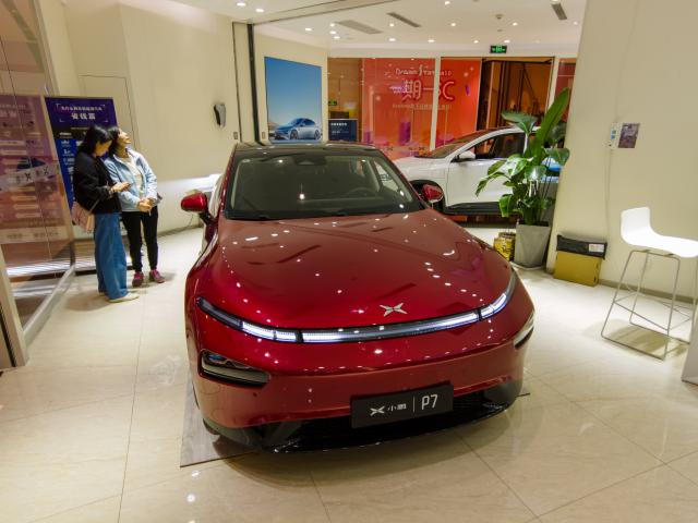 Cars_352Shanghai, China - Nov 16, 2020: Xpeng logo and P7 model in store in downtown Xpeng or Xiaopeng Motors also known as XMotors.ai, is a Chinese electric vehicle manufacturer. Business and finance concept