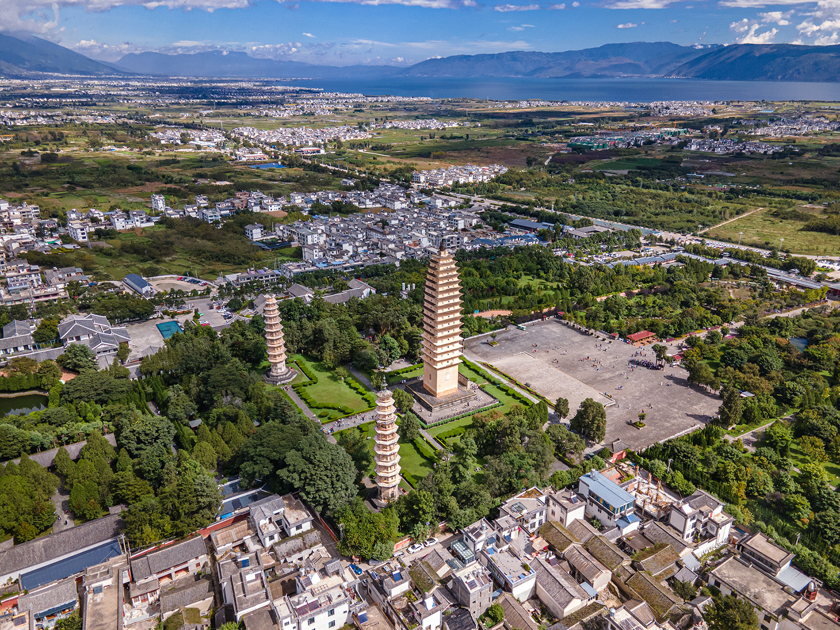 temple_085Aerial view of the Three Pagodas of Chongsheng Temple near Dali Old Town, Yunnan province, China. Three Pagodas, Dali, Yunnan: The oldest of these three Buddhist towers dates back to the mid-ninth century. At 69 meters and 16 stories high, it was