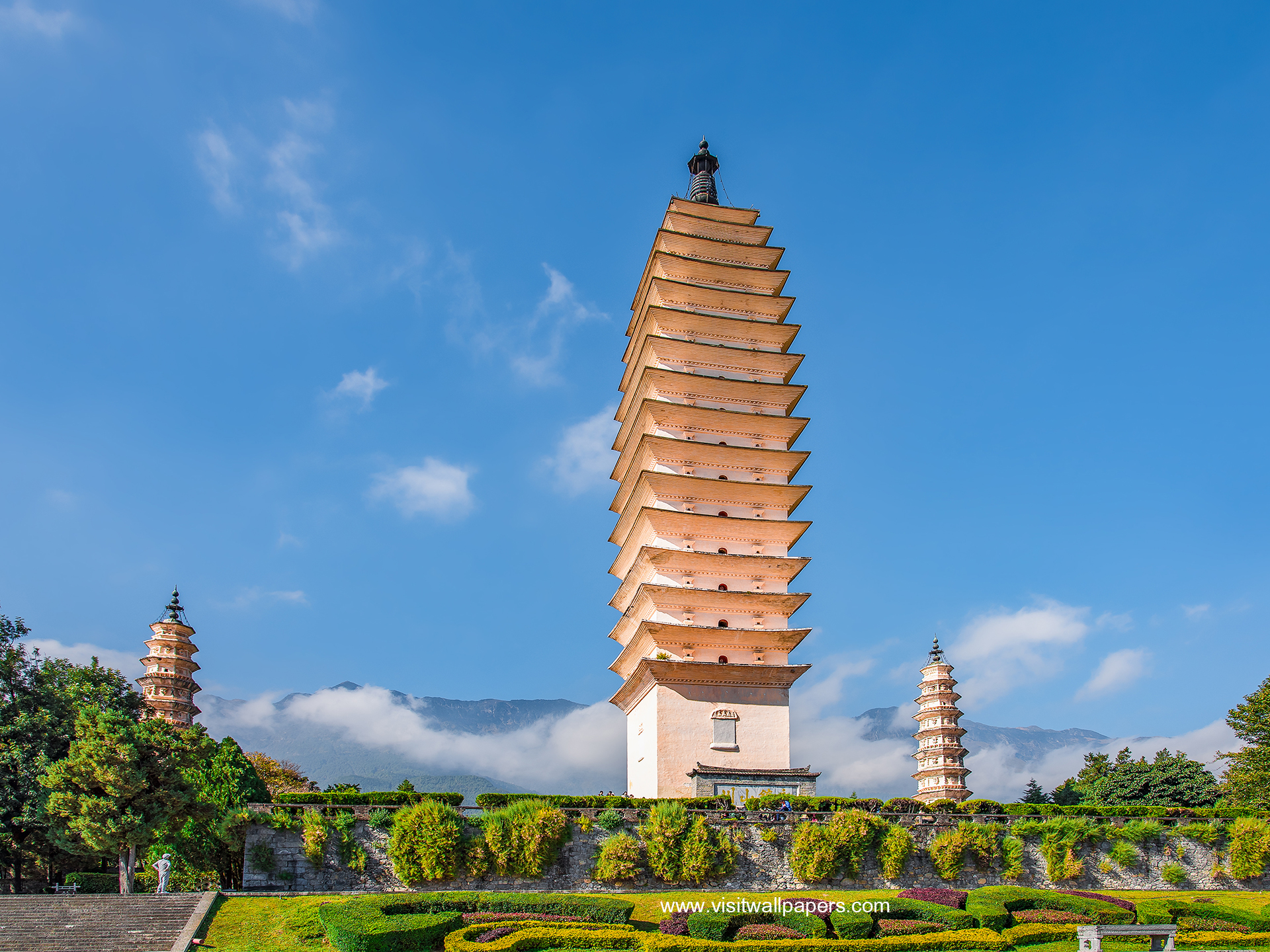 The three pagodas are just north of downtown Dali. Direct flights (30 minutes) and train (eight hours) are available between Dali and Kunming, the provincial capital of Yunnan.