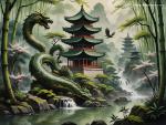 temple_120Majestic chinese dragon with scales of jade and gold, coiled around an ancient pagoda nestled in a misty bamboo forest. Sunlight filters through the bamboo, casting dappled shadows on the scene. The air is filled with the scent of incense and blooming c