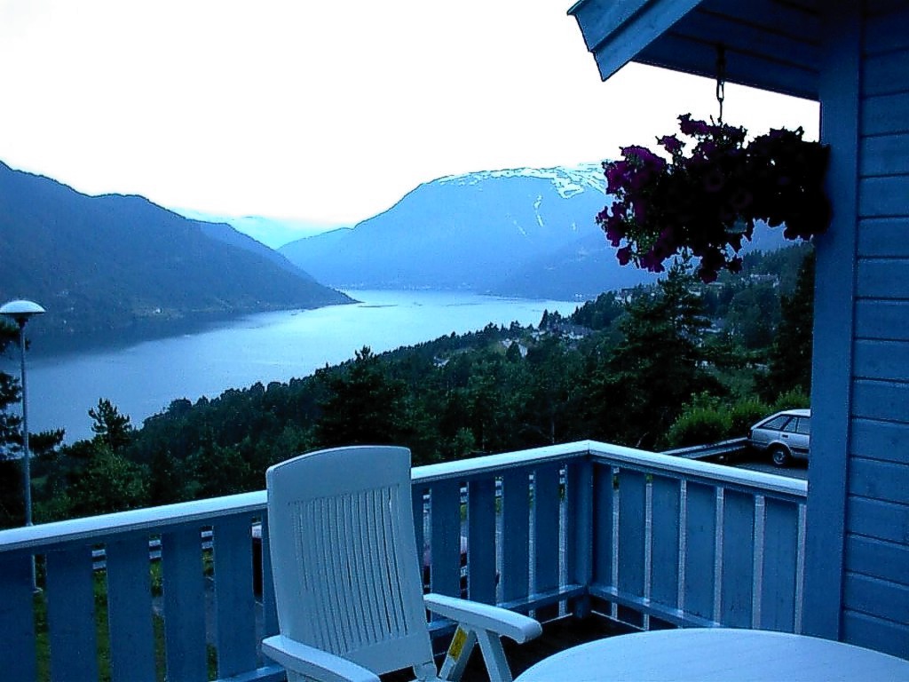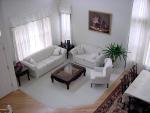 Panorama view bedroom 3d render, There are curve room with white floor, Furnished with white bed, There are large framless bay window overlooking to sea view.