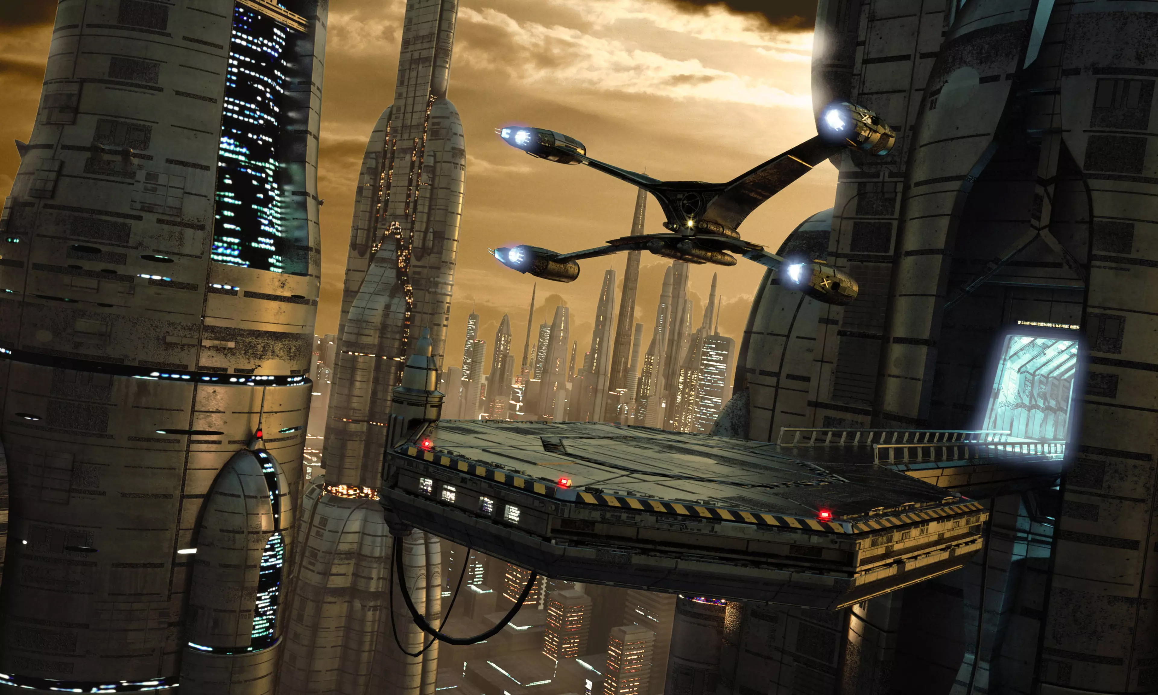 Science-fiction city scene with starfighter touching down (3D render)
