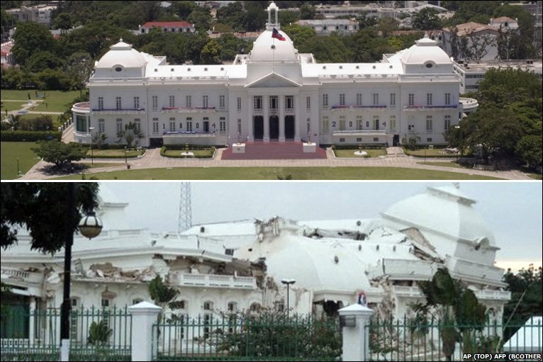 haiti_21Split image shows the Haitian Presidential Palace before and after the quake that took place on January 12, 2010. President Preval was unable to sleep or work in the building.