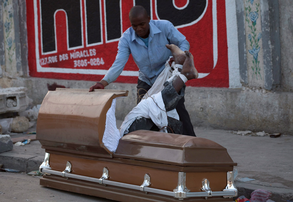 haiti_sixdayslater_031A man pulls the body of an earthquake victim from a coffin in order to steal the coffin at the cemetery in Port-au-Prince, Friday, Jan. 15, 2010. (AP Photo/Ramon Espinosa)