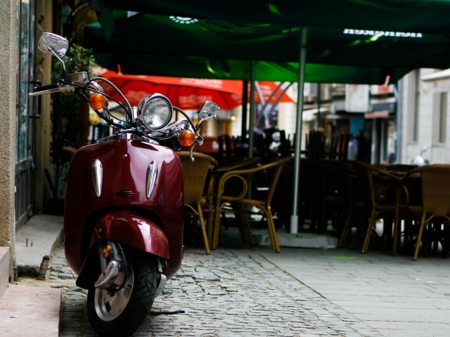 Cyberpunk motorcycle in a seedy downtown street of a fantasy dystopian future city. Cinematic 3D illustration.