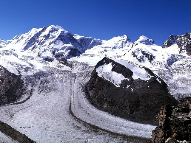mountains_299 The Matterhorn is a mountain of the Alps, straddling the main watershed and border between Switzerland and Italy. It is a large, near-symmetrical pyramidal peak in the extended Monte Rosa area of the Pennine Alps, whose summit is 4,478 metres (14,692 ft) Date: 12/2/2018 The Matterhorn is a mountain of the Alps, straddling the main watershed and border between Switzerland and Italy. It is a large, near-symmetrical pyramidal peak in the extended Monte Rosa area of the Pennine Alps, whose summit is 4,478 metres (14,692 ft) high, making it one of the highest summits in the Alps and Europe. The four steep faces, rising above the surrounding glaciers, face the four compass points and are split by the Hörnli, Furggen, Leone/Lion, and Zmutt ridges. The mountain overlooks the Swiss town of Zermatt, in the canton of Valais, to the north-east and the Italian town of Breuil-Cervinia in the Aosta Valley to the south. Just east of the Matterhorn is Theodul Pass, the main passage between the two valleys on its north and south sides, and a trade route since the Roman Era.