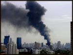 Dark smoke rises above Bangkok, Thailand as Red Shirt protesters burn tires at a main road downtown on Sunday, May 16, 2010. (AP Photo/Vincent Yu)