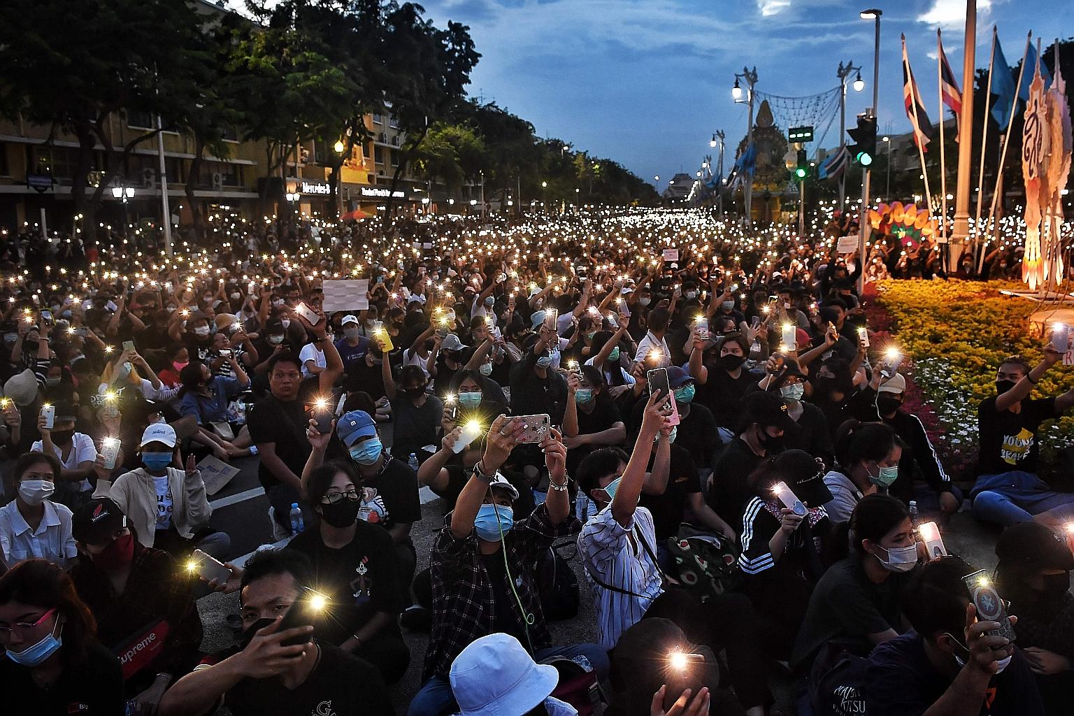 Anti-government protesters holding up their phone flashlights during a rally at Democracy Monument in Bangkok, Thailand, on Aug 16, 2020.