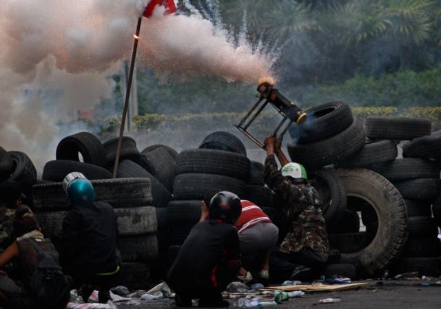 A demonstrator uses a slingshot against security forces during clashes in Bangkok on May 15, 2010. (PEDRO UGARTE/AFP/Getty Images)