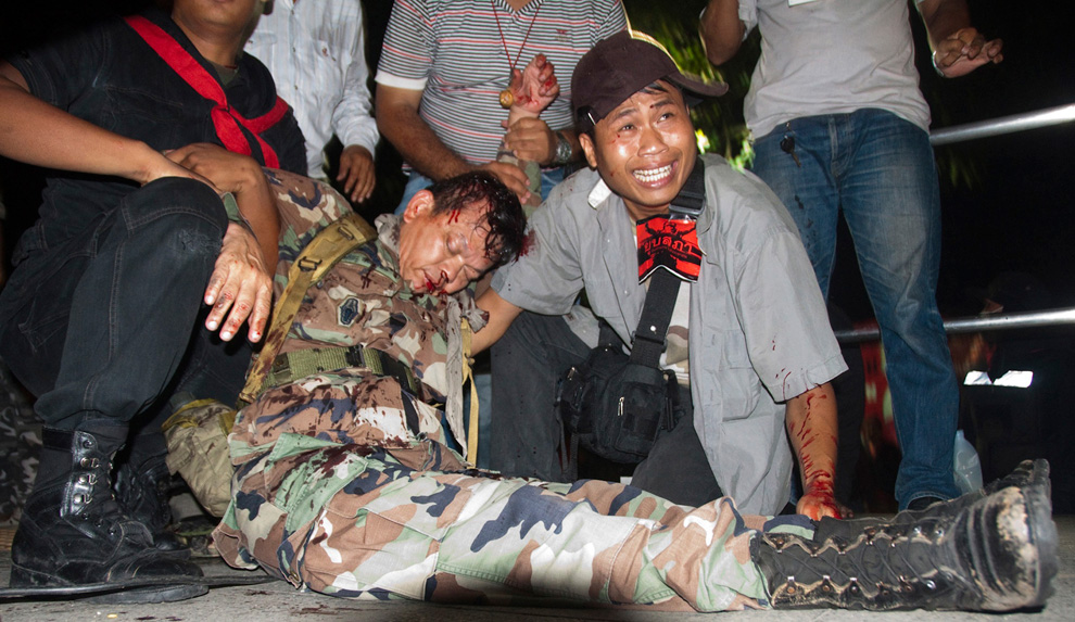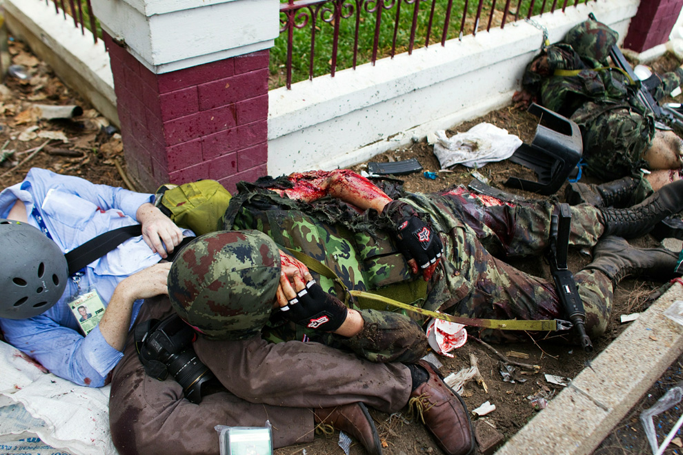 protests_039Canadian journalist Chandler Vandergrift (left) lies wounded near injured Thai soldiers after they were hit by a grenade on May 19, 2010 in Bangkok, Thailand. (Athit Perawongmetha/Getty Images)