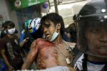 A Red Shirt protester who had been shot in the head is carried into a hospital on Wednesday, May 19, 2010, in Bangkok, Thailand. (AP Photo/Wally Santana)
