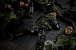 Thai soldiers in riot gear rest under a bridge outside the fortified camp of the Red Shirt movement in downtown Bangkok on May 13, 2010. (NICOLAS ASFOURI/AFP/Getty Images)