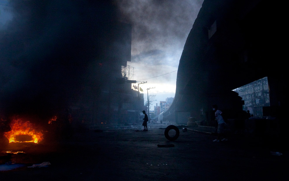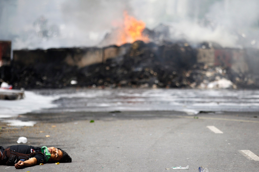 protests_036The body of a protester who was killed during an operation to evict Red Shirt protesters from their encampment lies in the street in front of a burning barricade in Bangkok May 19, 2010. (REUTERS/Damir Sagolj)
