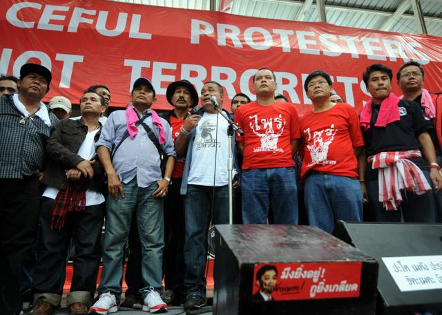 Red Shirt anti-government protest leaders announce their surrender to a gathered crowd from the stage inside the protesters' camp in downtown Bangkok on May 19, 2010. Thai protest leaders surrendered and told thousands of Red Shirt supporters to end their weeks-long rally after an army assault on their fortified encampment. (PORNCHAI KITTIWONGSAKUL/AFP/Getty Images)