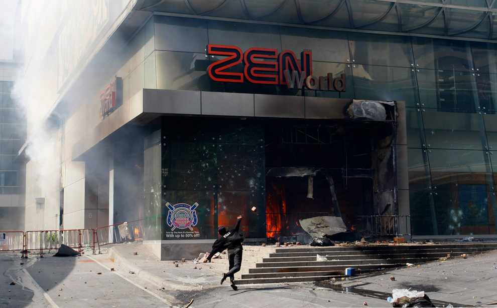 protests_043A Red Shirt protester throws a rock at a burning shopping mall on Wednesday, May 19, 2010. (AP Photo/Wason Wanichakorn)