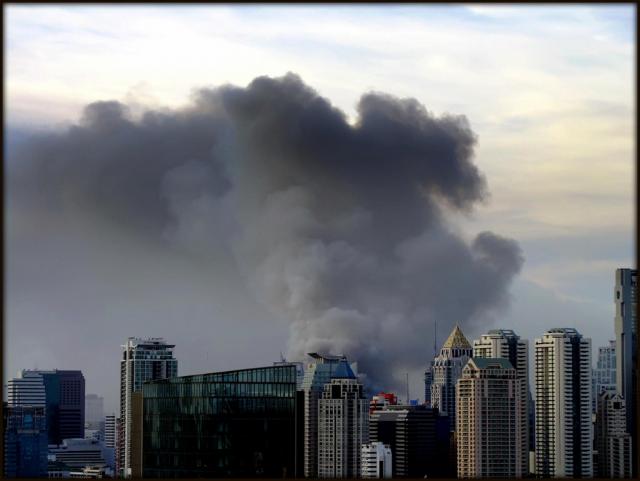 protests_035Smoke billows from fires in a commercial area of Bangkok where Red Shirt demonstrators had their camp on May 19, 2010. Thai fire authorities said that arsonists have set 20 locations ablaze in Bangkok, including a massive shopping mall and bank branches.